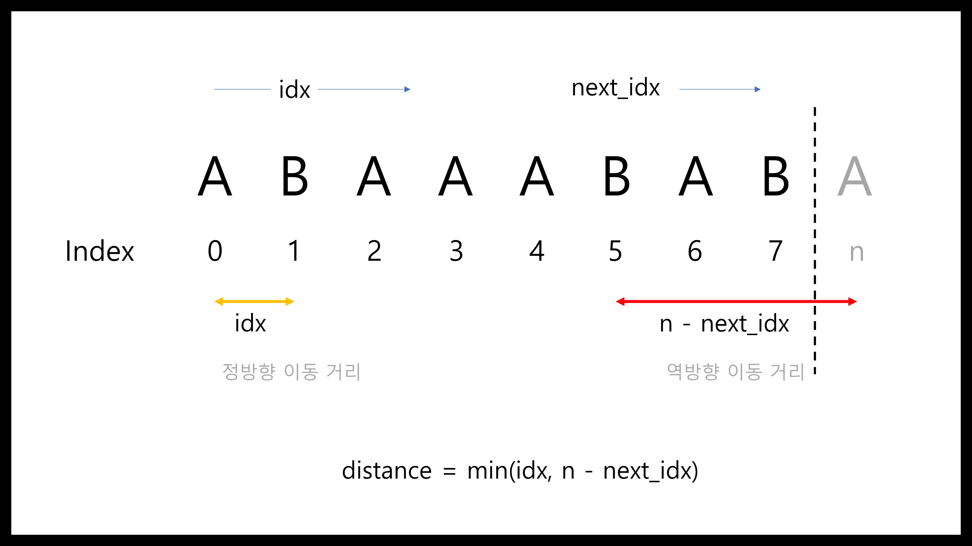 - 따라서, 'ABBAAAA' 같은 케이스에서도 정방향 거리로 최솟값이 성립할 수 있다.