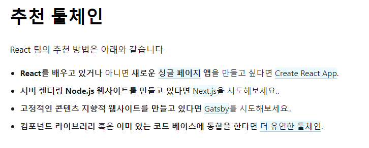 CRA를 포함하여 Next.js이나 Gatsby 등 프로젝트 목적에 따라 다양한 툴체인을 활용하시는게 확실히 편합니다.